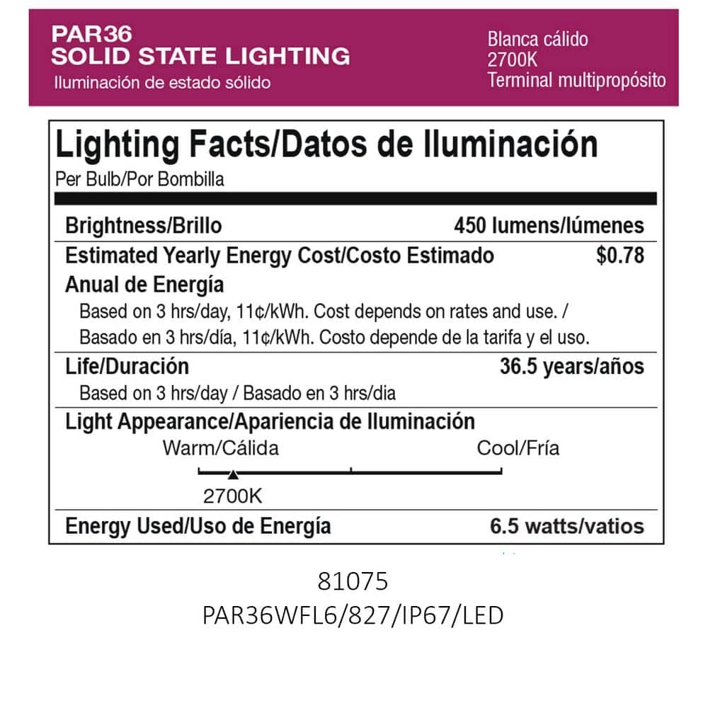 ProLED Waterproof PAR36 Series provides improved efficiency by lowering wattage consumption and increasing light output over traditional Halogen PAR36 lamps. 81% energy savings versus halogen lamps. IP67 rated for waterproof installations of temporary immersion at a limited depth.