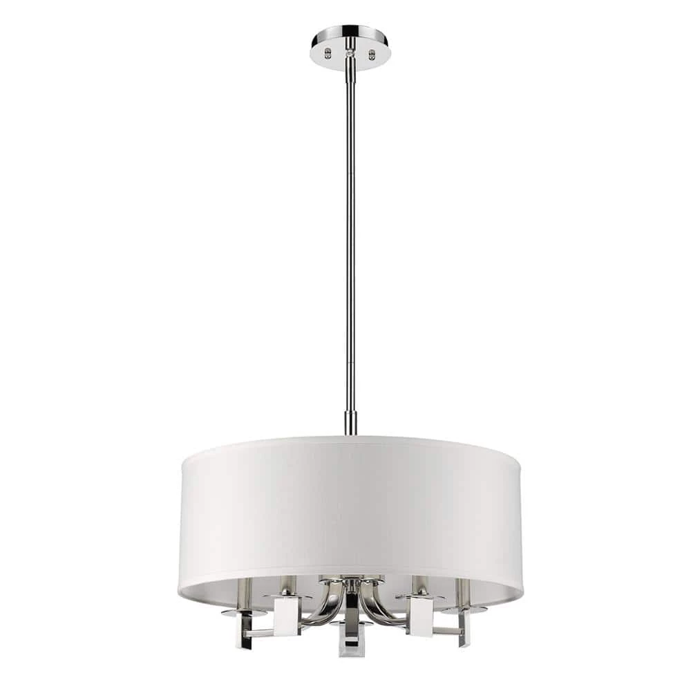Andrea Indoor 5-Light Pendant with Fabric Drum Shade in Polished Nickel. This pendant is of modern-contemporary design, can be used singly or in groupings to illuminate a room, cast light throughout a space or provide focus for the task at hand. With the flip of a switch, a house becomes a home, a room becomes an oasis and a thought becomes a feeling. Thanks to a simple, special glow of light.