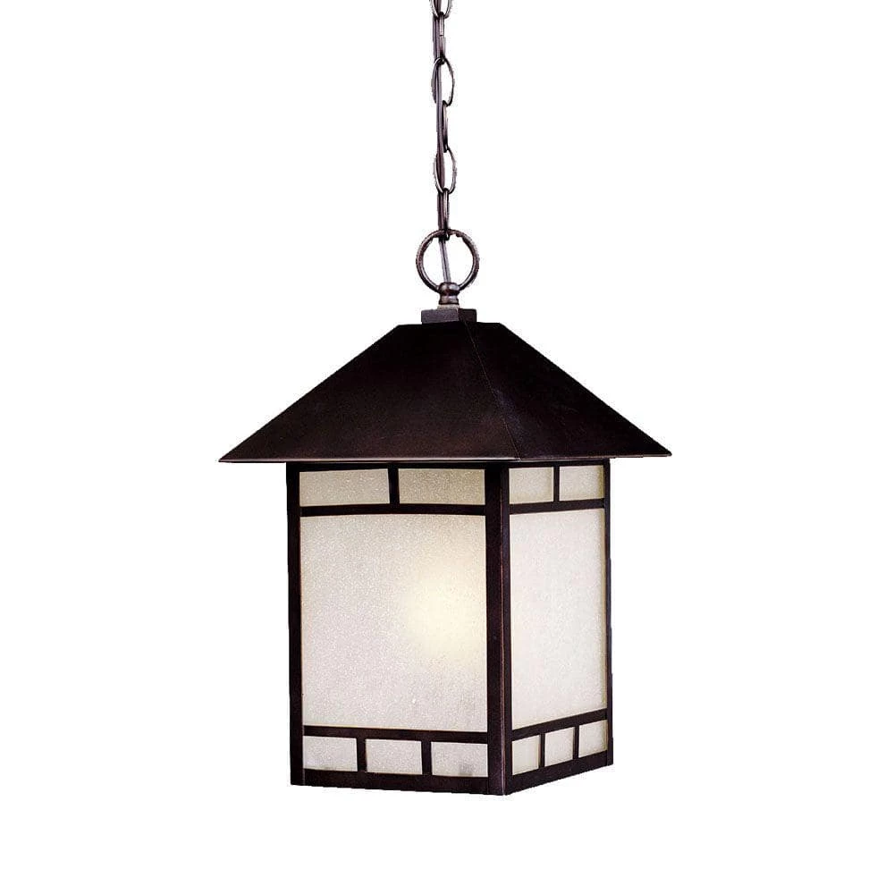 The Artisan collection 1-light hanging lantern is made of powder coated steel. The frosted seeded glass panels work well with energy-efficient LED lamps, providing soft, inviting illumination. This craftsman-inspired style complements many other architectural styles as well.