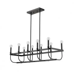 The Beckett island light features a simple design in a county-industrial style. It can be dressed up or down depending on the type of light bulbs used. This charming fixture is available in a popular matte black finish.