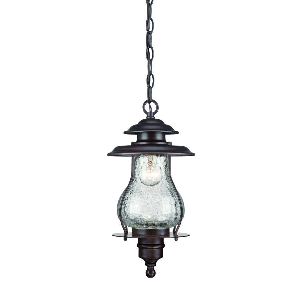 The Blue Ridge collection evokes memories of gas coach lanterns of yesteryear. The chimney shaped, clear crackled glass shade adds mountain charm. Constructed of powder-coated steel to withstand the elements.