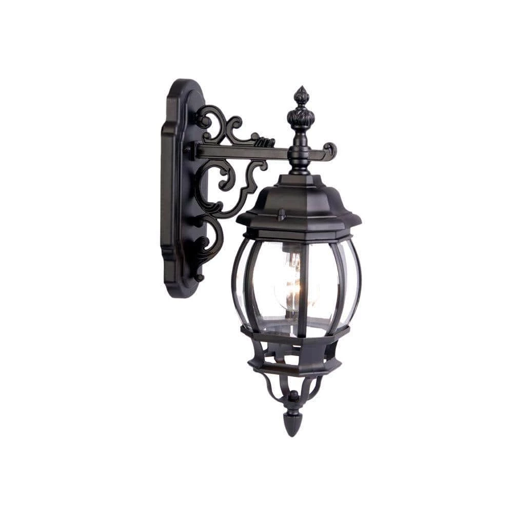 The Chateau collection boasts a simple, classical style. This lantern features elegant scrollwork and clear beveled glass panes. It’s cast aluminum construction resists rust and corrosion.