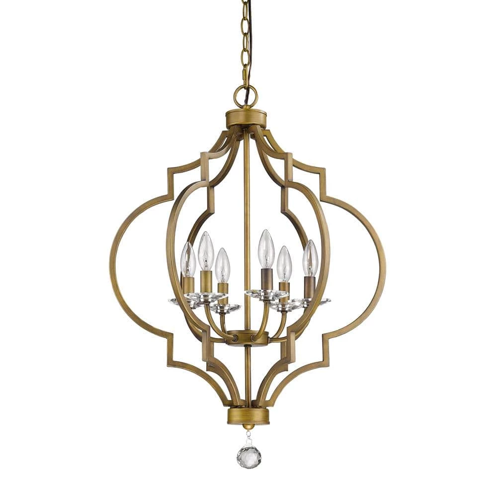 Peyton Indoor Collection – 6-Light Chandelier with crystals and bobeches in Raw Brass. This chandelier is of a “worldly” look including crystal bobeches and one K-9 Crystal. With a flip of a switch, A house becomes a home, A room becomes an oasis, A thought becomes a feeling. Thanks to A simple, special glow of light.