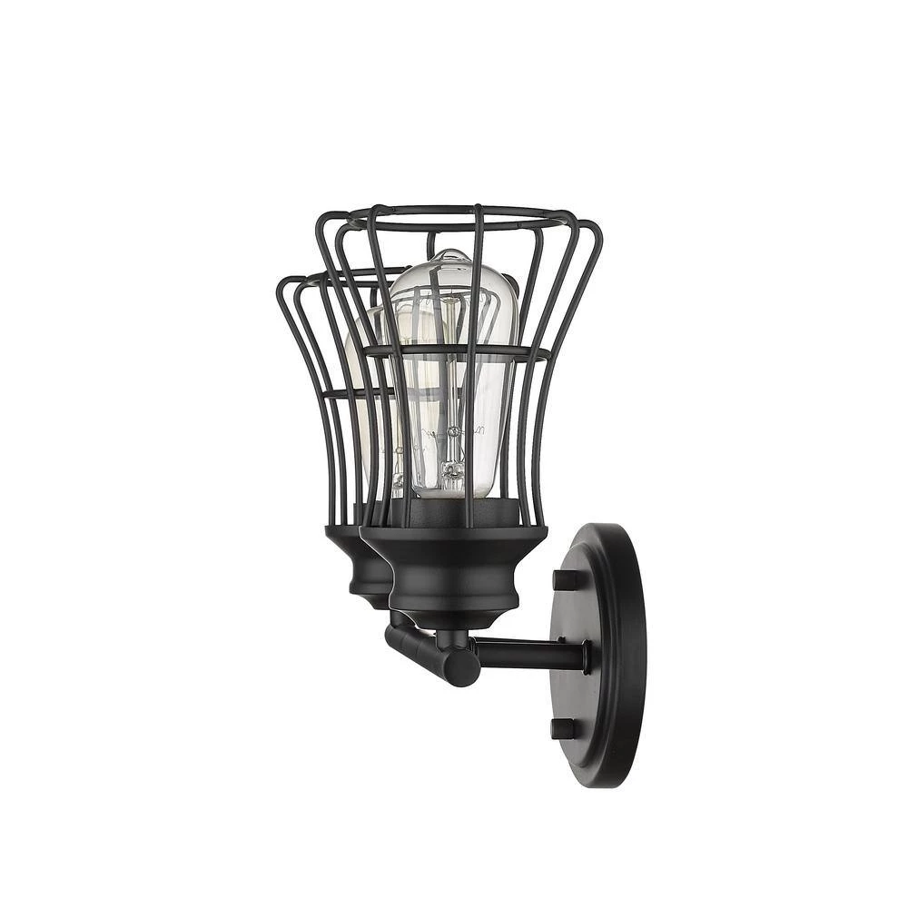 Piers features metal framework reminiscent of the workshop with soft styling that is perfect for the bath. The oil-rubbed bronze or matte black finish continues onto the metal cage shades. Piers may be mounted in an upward or downward position.
