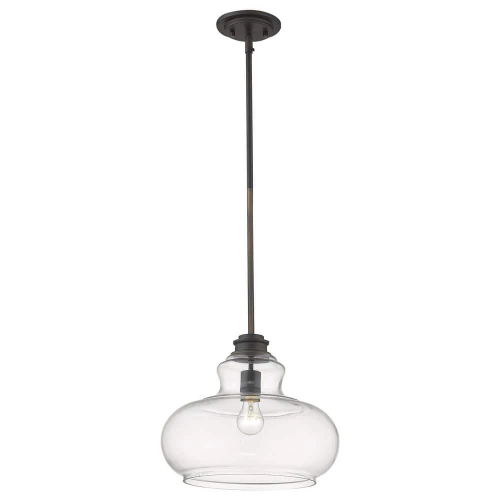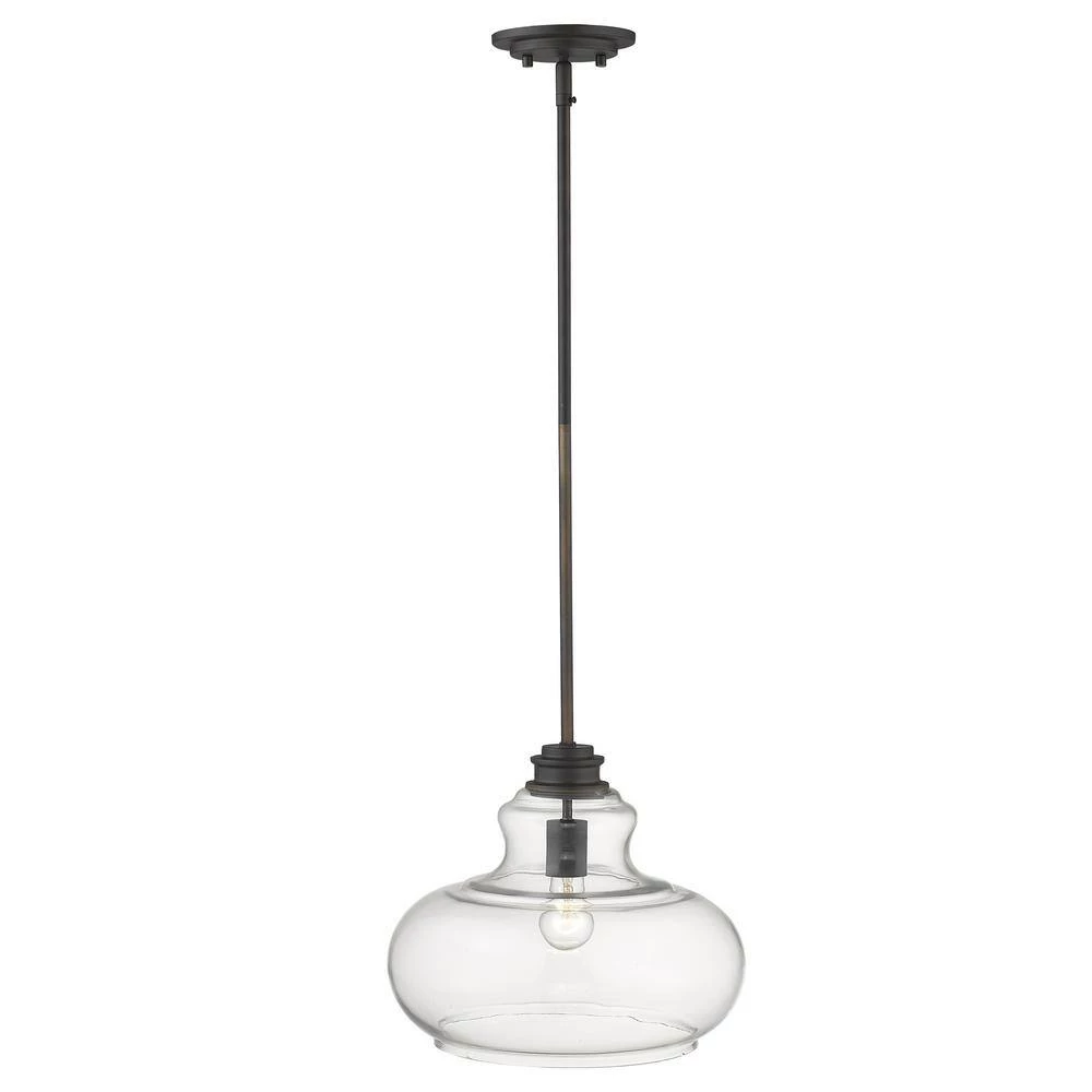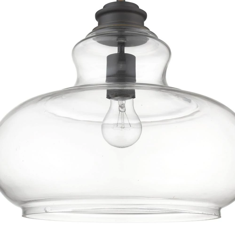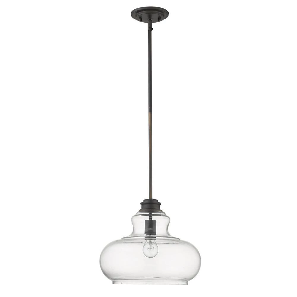 The Torrel pendant features a fresh take on a lunch counter light. A single bulb is housed inside of an airy, bell-shaped globe of clear glass. Available in satin nickel and oil-rubbed bronze.